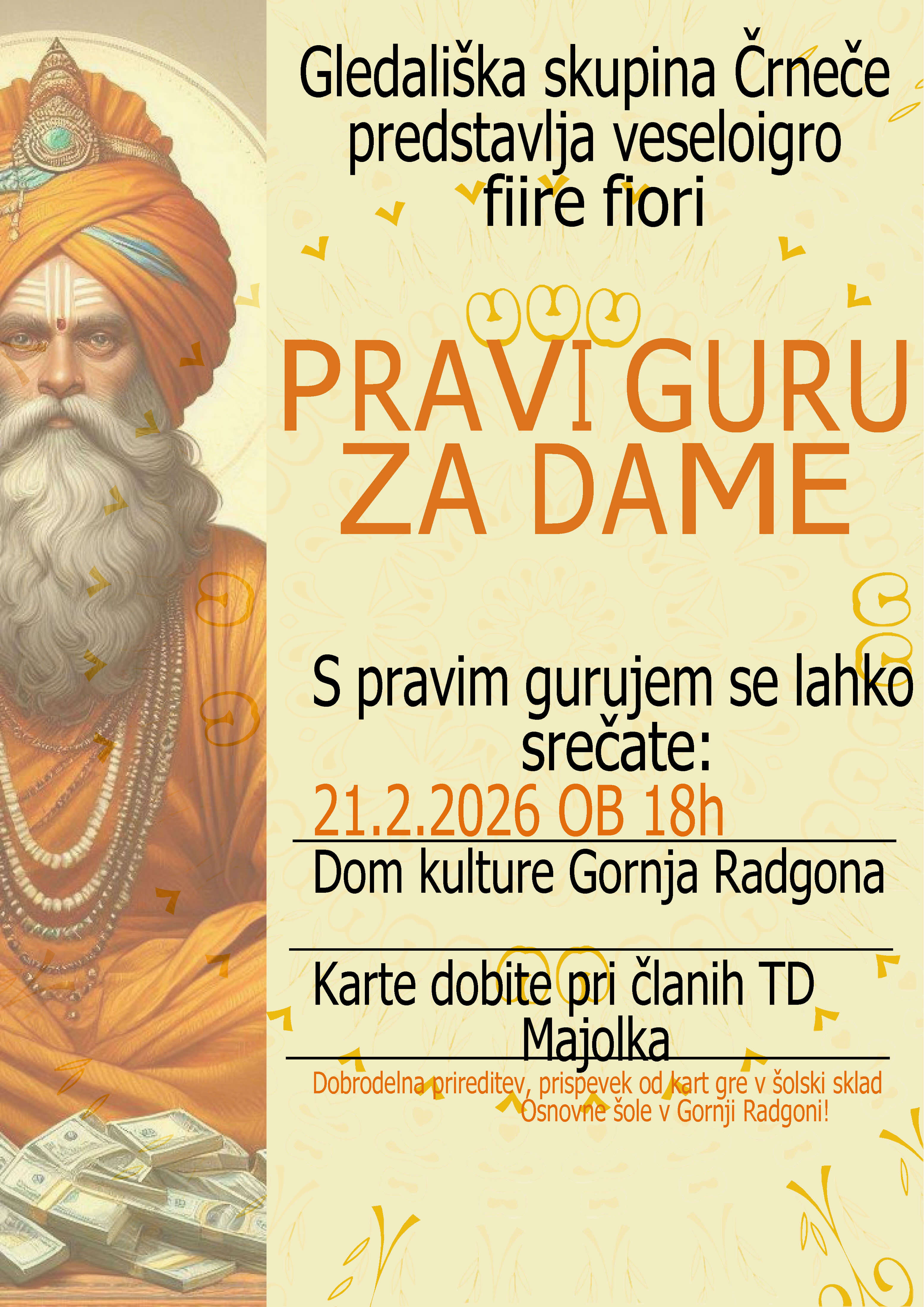 TD Majolka vas vljudno vabi na dobrodelno prireditev veselo igra “Pravi GURU za dame”, ki smo jo prejeli v dar od gledališke skupine Črneče ob 20. letnici delovanja.